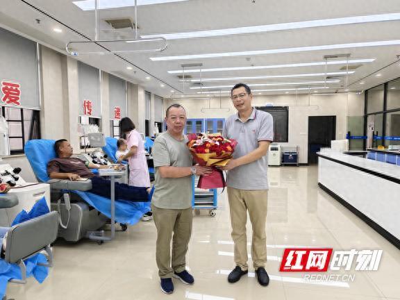 责任主说念主员为杨吉斌(左)授花开yun体育网 红网技能新闻10月16日讯(通信员 曹怡霏)10月15日,是献血者杨吉斌60岁生辰,郴州市中心血站在机采献血大厅为他举行了情切的荣退庆典,以鲜花和掌声感谢他一直以来的忘我奉献,并为他奉上好意思好祝贺。 庆典中,责任主说念主员为杨吉斌授花、颁证,并调停了操心保温杯,庆典中的掌声一阵接着一阵,令杨吉斌相称感动。 杨吉斌1999年驱动献血,是《献血法》颁布以来郴州第一批献血者之一,见证了郴州无偿献血业绩从无到有、再到茁壮发展的历史。“我赴任于郴州市科技
