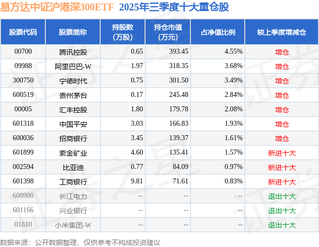 从基金畛域来看,易方达中证沪港深300ETF基金2025年三季度公布的基金畛域为0.86亿元,较上一期畛域6779.86万元变化了1869.71万元,环比变化了27.58%。该基金最新一期钞票配置为:股票占净值比96.2%,无债券类钞票,现款占净值比4.77%。从基金抓仓来看,该基金当季前十大股票仓位达23.55%,第一大重仓股为腾讯控股(00700),抓仓占比为4.55%。